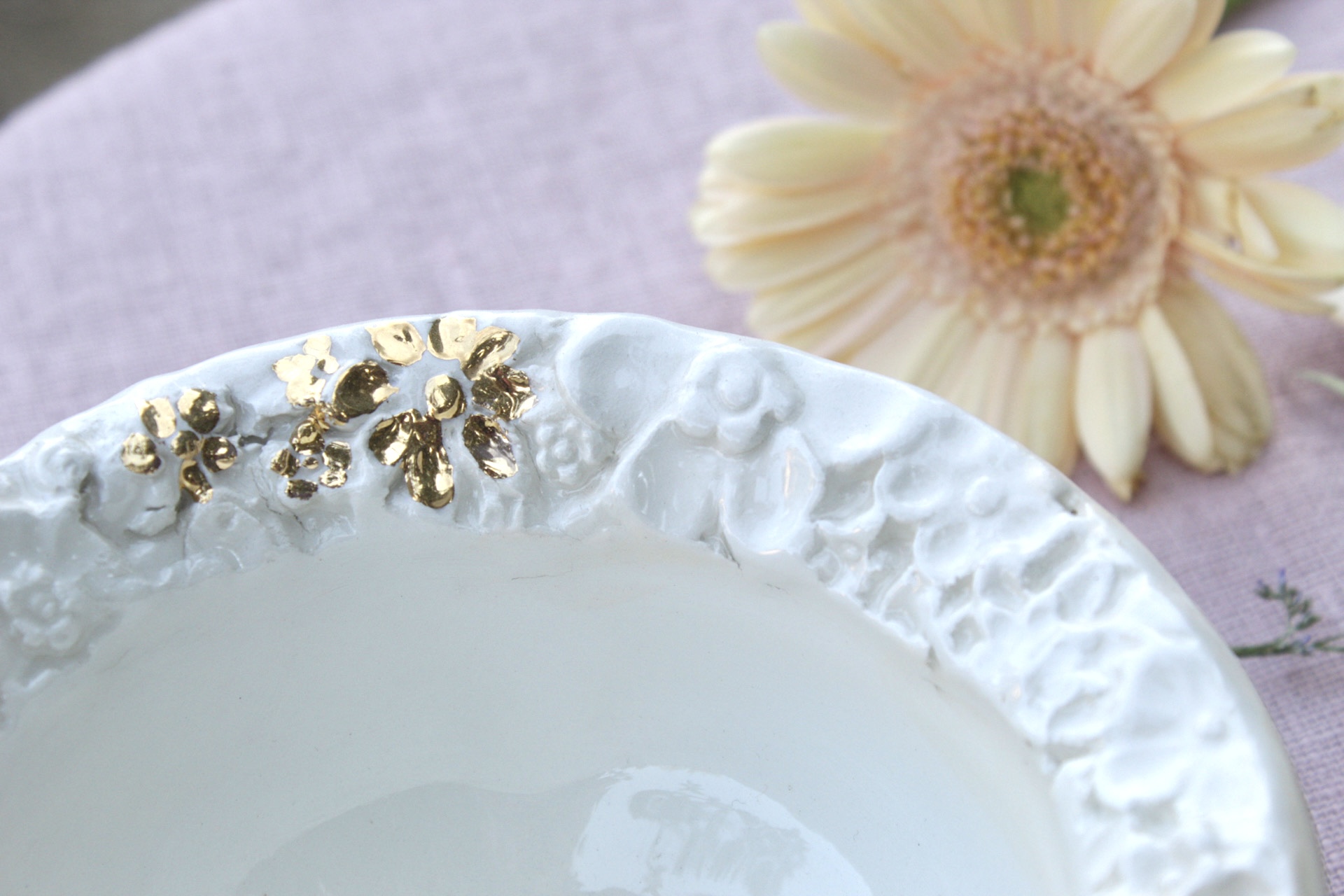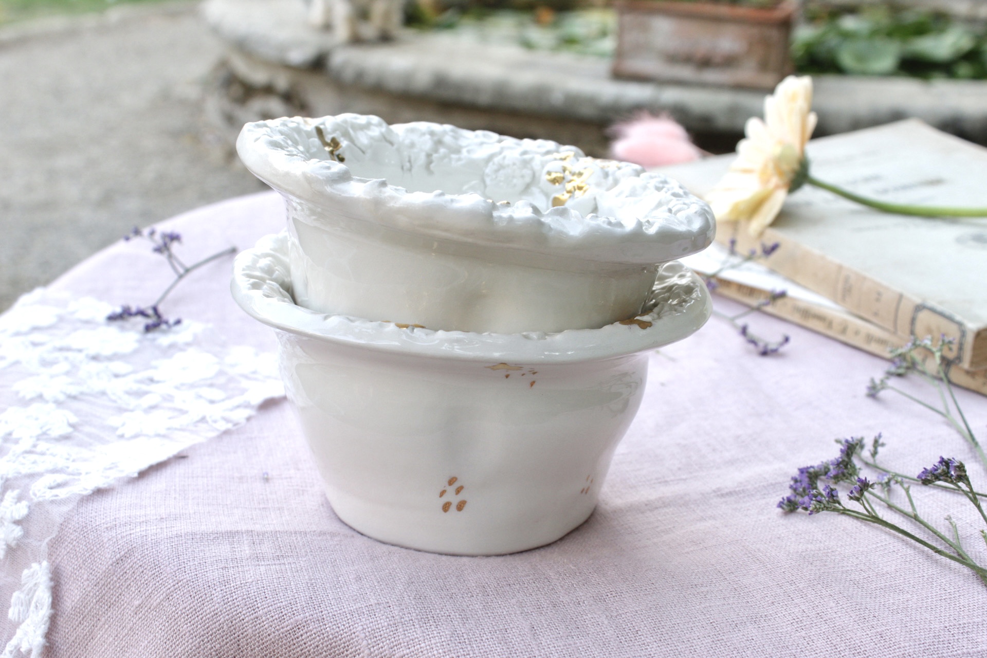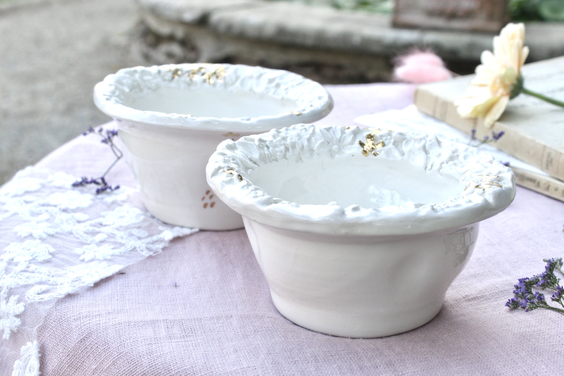 Due ciotoline dal bordo lavorato e prezioso con dettagli in vero oro 18Kt e fiori in rilievo
